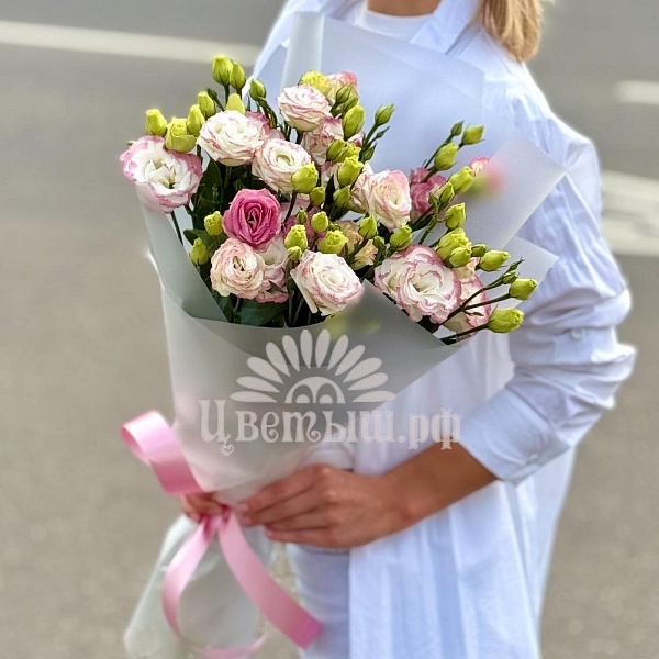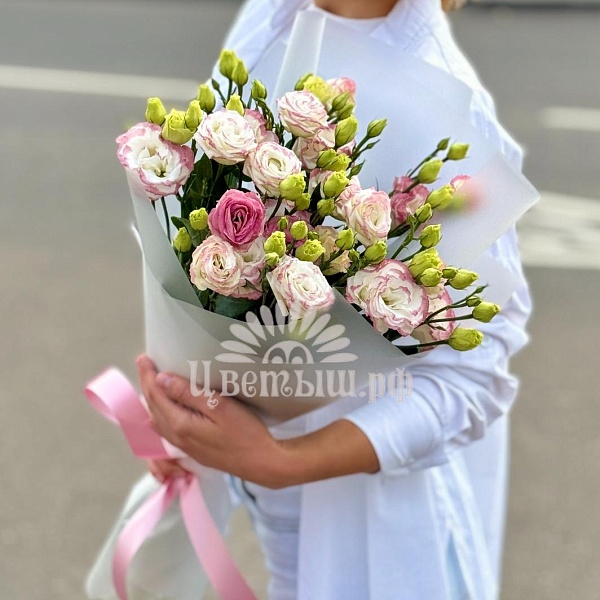 Букет из 9 нежных эустом — это утонченность, легкость и романтика в каждом лепестке. Белые и розовые цветы гармонично сочетаются между собой, создавая мягкий, воздушный образ. Эустомы известны своей элегантной формой и изящной окраской, что делает букет особенно трогательным и женственным. Он словно передает тихое «я думаю о тебе» без лишних слов.