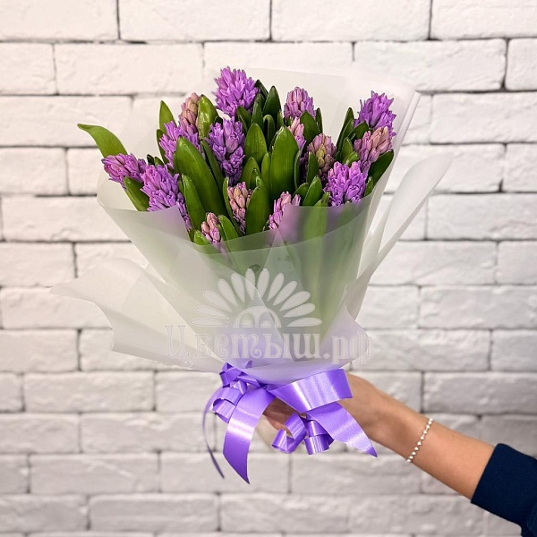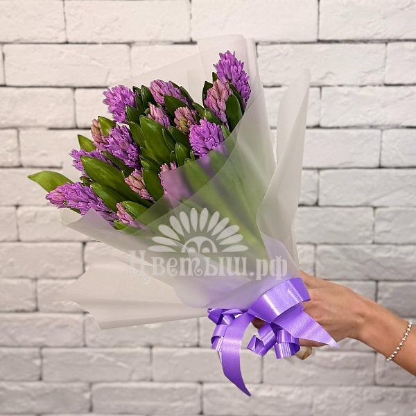 В каждом распускающемся цветке – весеннее волшебство. Букет создан из 15 гиацинтов. Красочный и благоухающий, он станет подлинным олицетворением весеннего настроения или отличным сюрпризом для дорогого вам человека. Мягкие тона гиацинтов, искусно объединенные в цельную композицию, одарят бодростью и положительными эмоциями.