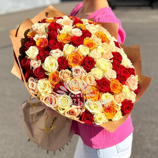 101 разноцветная роза ассоциируется с серьезными чувствами, надеждой, любовью и искренностью. Композиция символизирует щедрость, уважение, внимание, честность. Подарить ее уместно на свадьбу,1 сентября, в День Рождения, в честь повышения по карьерной лестнице, на выпускной вечер.