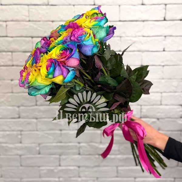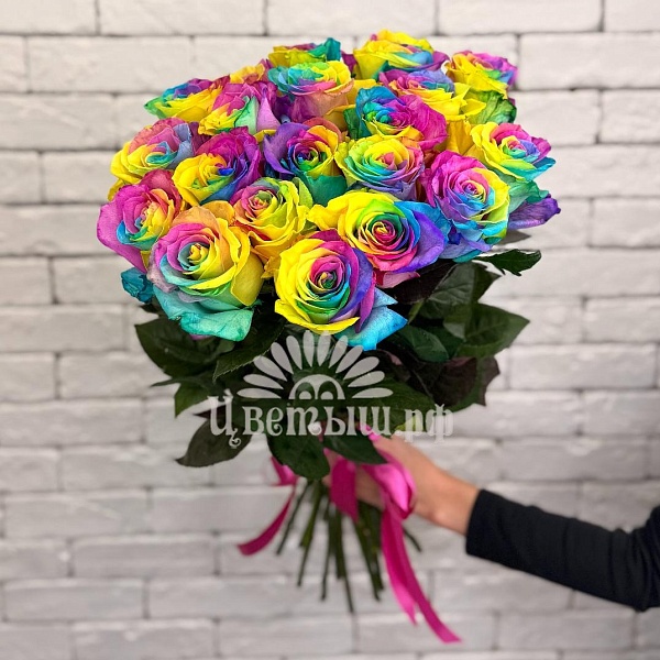 Букет из 21 радужных роз — яркая, креативная и эмоционально насыщенная цветочная композиция, которая привлекает внимание своей необычной палитрой. Радужные розы создают настроение праздника, радости и вдохновения, делая этот букет эффектным и запоминающимся подарком для самых тёплых моментов!