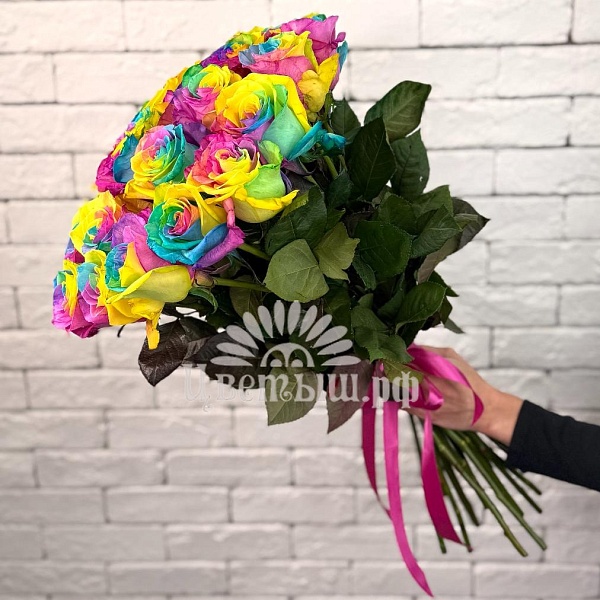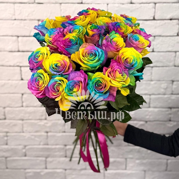 Букет из 25 радужных роз — яркая, креативная и эмоционально насыщенная цветочная композиция, которая привлекает внимание своей необычной палитрой. Радужные розы создают настроение праздника, радости и вдохновения, делая этот букет эффектным и запоминающимся подарком для самых тёплых моментов!