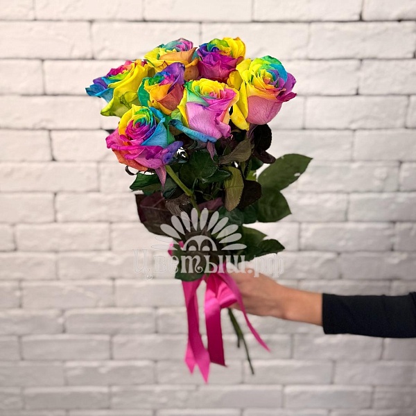 Букет из 7 радужных роз — яркая, креативная и эмоционально насыщенная цветочная композиция, которая привлекает внимание своей необычной палитрой. Радужные розы создают настроение праздника, радости и вдохновения, делая этот букет эффектным и запоминающимся подарком для самых тёплых моментов!