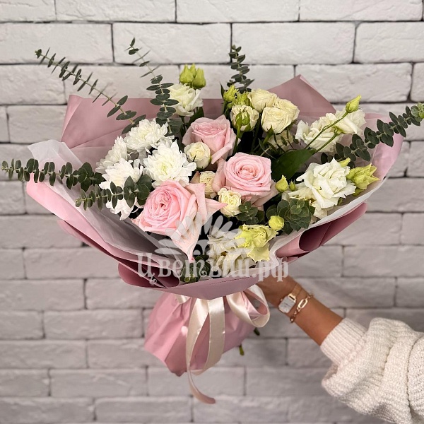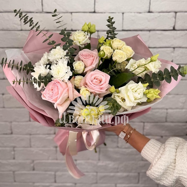 Букет гармония нежности, легкости и элегантного стиля. Все цветы бережно собраны и оформлены в современную пленку, дополненную атласной лентой.