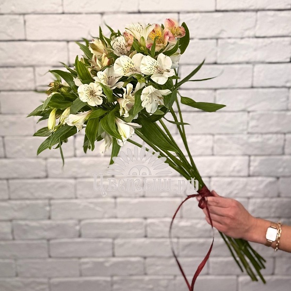 Букет из 11 белых альстромерий — классический символ нежности и благородства. Эти изящные цветы с их чистейшим белым оттенком и грациозными линиями говорят об искренней заботе, восхищении и пожелании удачи. Букет выглядит свежо, современно и стильно, идеально подходит для любого светлого повода.