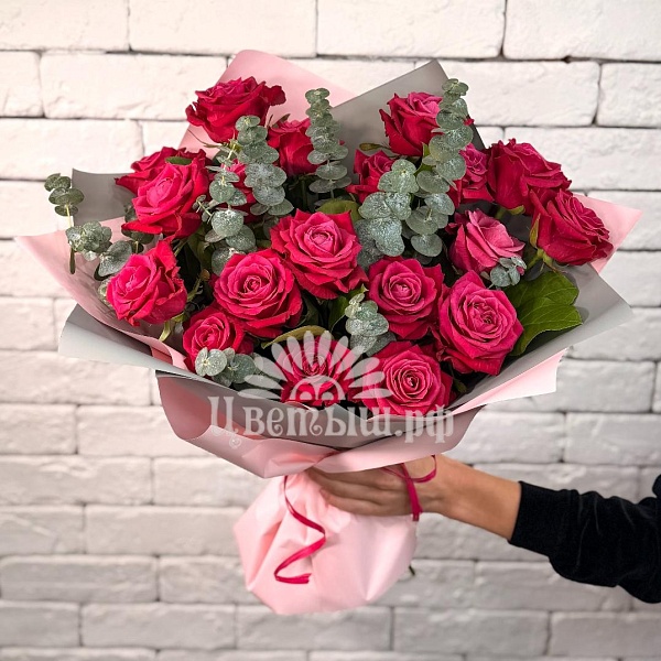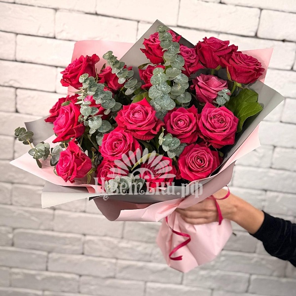 Букет 19 малиновых роз с эвкалиптом