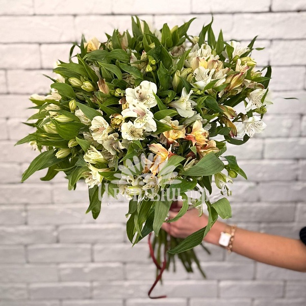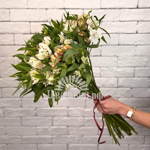 Букет из 25 белых альстромерий — классический символ нежности и благородства. Эти изящные цветы с их чистейшим белым оттенком и грациозными линиями говорят об искренней заботе, восхищении и пожелании удачи. Букет выглядит свежо, современно и стильно, идеально подходит для любого светлого повода.