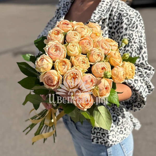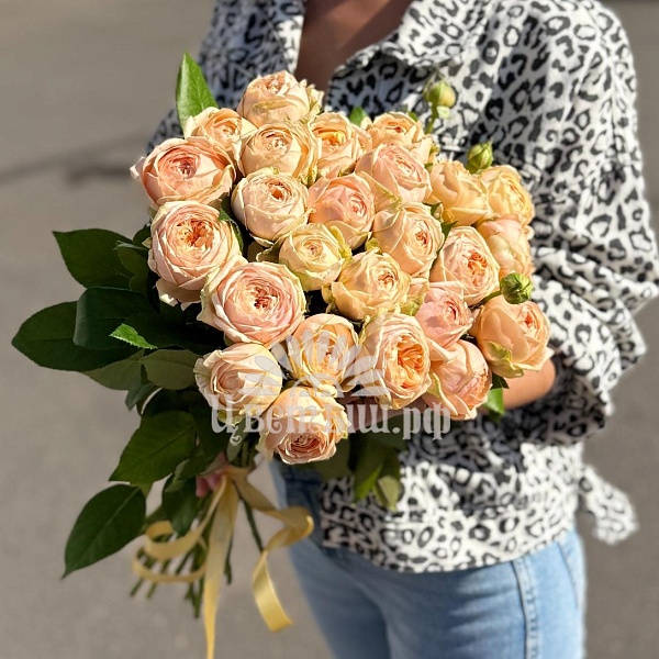 Букет 25 пионовидных роз «Sweet Catalina» — это воплощение утончённости, элегантности и романтичности. Нежные персиково-абрикосовые оттенки, густомахровые бутоны и лёгкий фруктовый аромат создают атмосферу тепла и уюта.