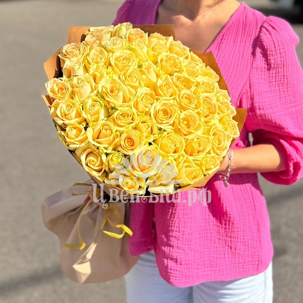 Эффектный букет из 51 желтой розы Peach Avalanche – яркий, нежный и роскошный подарок. Цветы с воздушными персиковыми соцветиями буквально светятся – они излучают яркое летнее солнце и создают ощущение тепла.