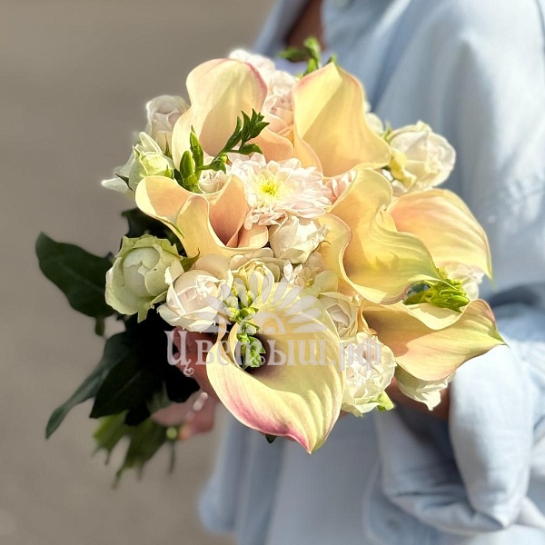 Букет невесты составлен из нежных калл с бледно-желтыми лепестками и ярко-зелеными листьями. Такие цветы отличаются строгой утонченной формой – букет будет смотреться одновременно стильно и изысканно. Оформление в нежных пастельных тонах сделает его эффектным завершающим штрихом для образа невесты. На «языке цветов» каллы являются символом нежной любви, они указывают на чистоту чувств, преданность и верность.