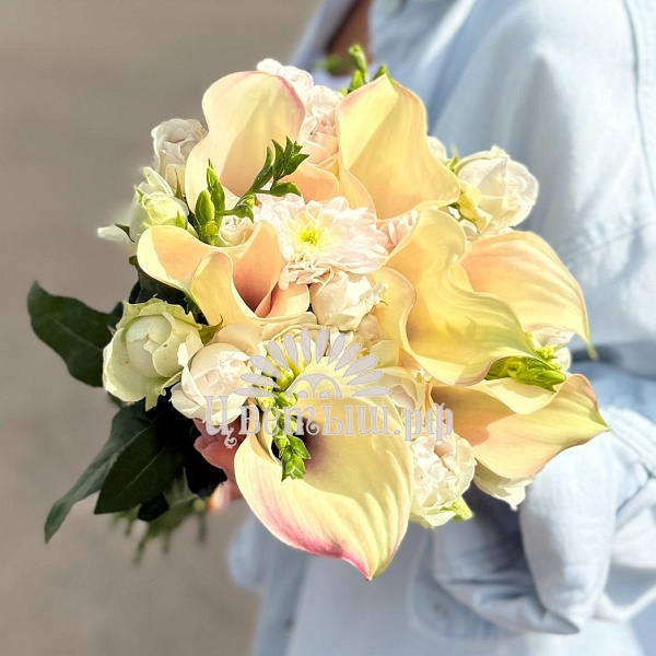 Изысканный нежный букет будет соответствовать любому стилю свадьбы, от классического до самого необычного и оригинального. Каллы не боятся холода, поэтому такая композиция не потеряет красоты в течение всего свадебного дня зимой или поздней осенью. Такие цветы могут подолгу оставаться без воды, они не завянут и будут смотреться безупречно. Закажите оригинальную свадебную композицию в интернет-магазине «Цветыш» с доставкой.